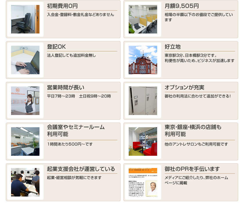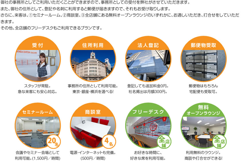 | 社名掲出 | 月額料金:300円 貴社の社名をオフィス受付に掲示致します。 |
